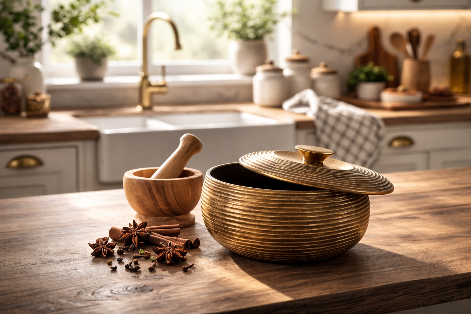 This handcrafted wooden storage container features a timeless round silhouette with a beautifully ribbed exterior that highlights the natural grain of the wood.Designed with a snug-fitting lid and a small raised knob, it offers both functionality and visual appeal. The smooth, polished finish in warm brown tones gives it a rustic yet elegant look, making it suitable for modern, traditional, or ethnic décor settings. Ideal for storing dry kitchen essentials, condiments, sugar, spices, or small household items, this container is made from durable solid wood and is not fragile like glass. Its compact, space-saving design makes it easy to place on countertops, shelves, or dining tables while adding a touch of handcrafted charm to your home.